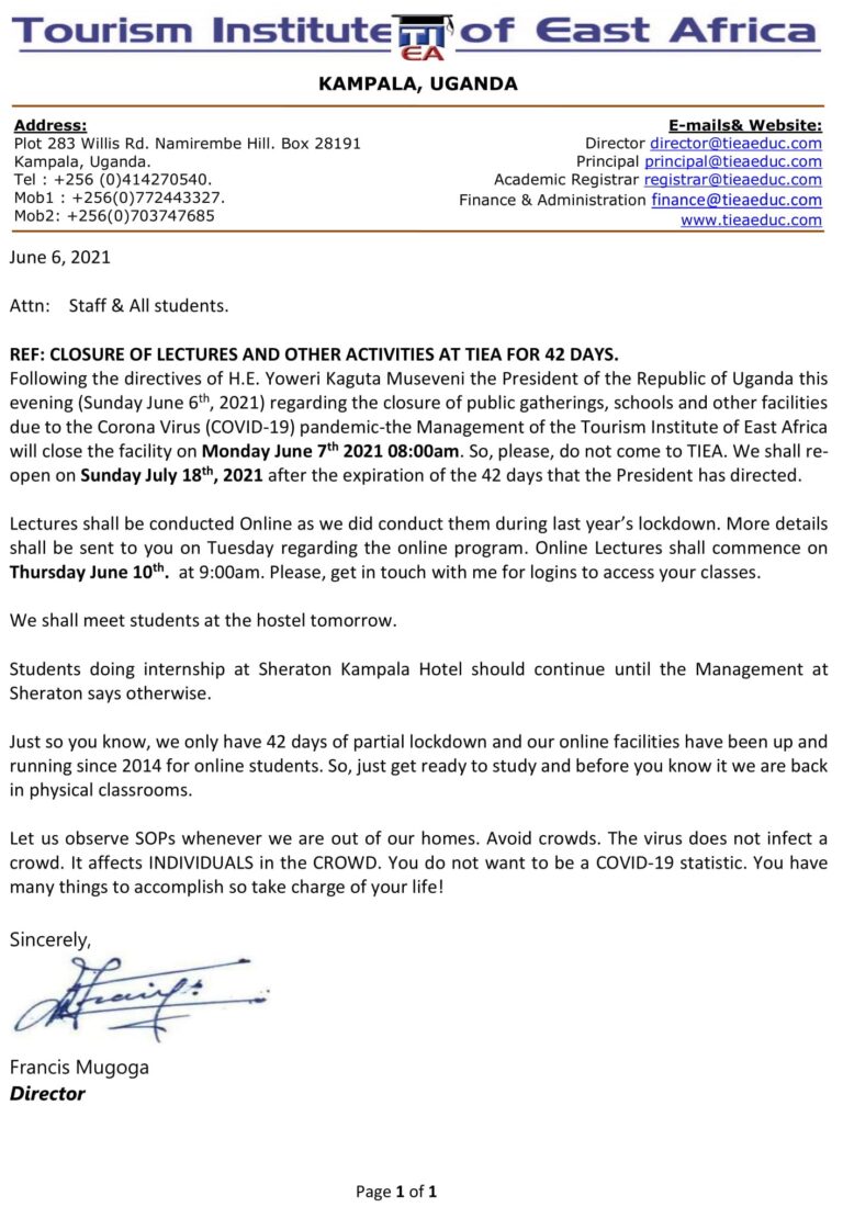 H.E. YOWERI KAGUTA MUSEVENI IMPOSES RESTRICTIONS ON SUNDAY 6TH/JUNE/2021 All schools and