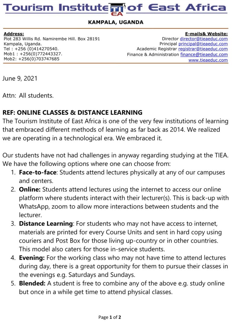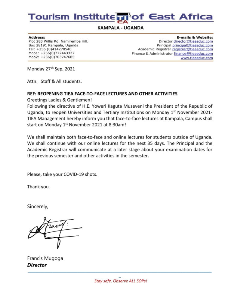 Uganda Airlines Uganda Airlines has undertaken the necessary safety measures in compliance with approved Lectures to continue online at TIEA Reopening Face-to-face Lectures 1 2
